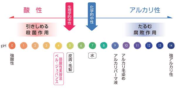 髪や皮膚が健康でみずみずしくあるためには、「人間の皮膚や髪のpH値であるpH5.0前後」の弱酸性がつねに保たれていなければなりません。さらにpH5.0未満の弱酸性域では、皮膚を清潔にして引き締める作用だけでなく、ベル・ジュバンストリートメントローションを使ったマニピュレーション(手指によるマッサージ)施術で毛穴にこびりついた老廃物を取り除くので、弱酸性ヘアエステ(頭皮洗浄)やトリートメントウェーブ(弱酸性パーマ)では、髪や頭皮が健やかになるだけでなく、きれいになった毛穴から新陳代謝が促進される「快適リラクゼーション効果」もあるのです。
